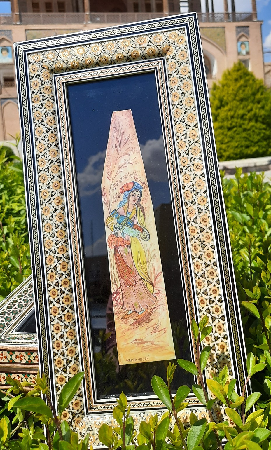 Khatamkari is an inlaying technique, the Persian version of marquetry. It is done by decorating a wooden or metallic object in various designs with very small pieces of wood, ivory, bone, and metal such as gold, silver, brass, aluminum, and twisted wire. Khatmkari is done on the surface of different objects such as jewelry boxes, clocks, photo frames, chessboards, pipes, tables, and a great variety of decorative objects.