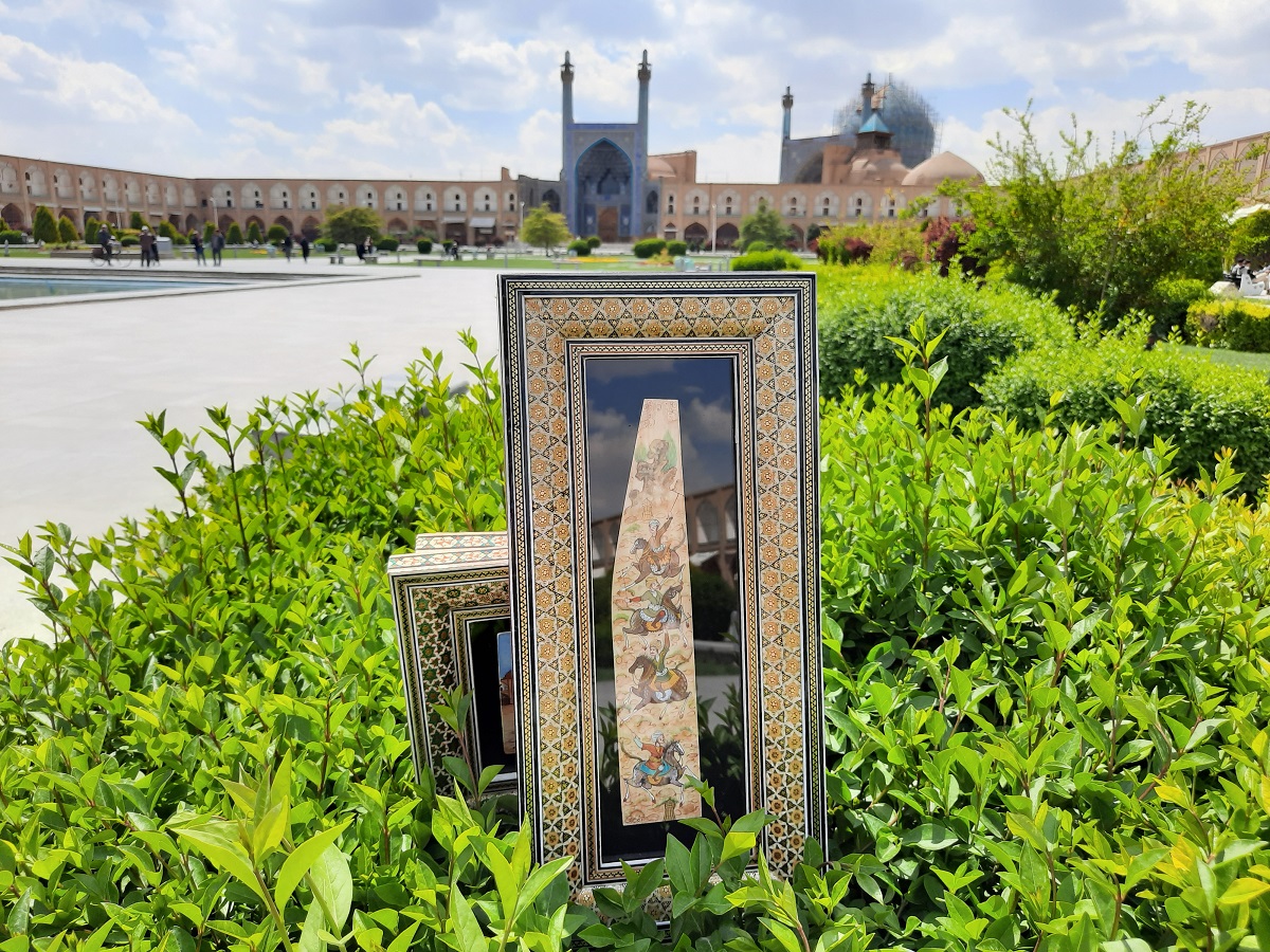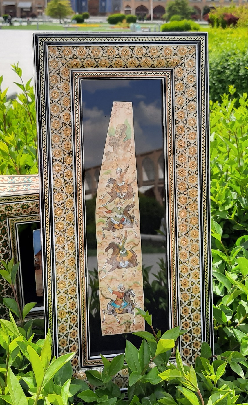 Khatamkari is an inlaying technique, the Persian version of marquetry. It is done by decorating a wooden or metallic object in various designs with very small pieces of wood, ivory, bone, and metal such as gold, silver, brass, aluminum, and twisted wire. Khatmkari is done on the surface of different objects such as jewelry boxes, clocks, photo frames, chessboards, pipes, tables, and a great variety of decorative objects.